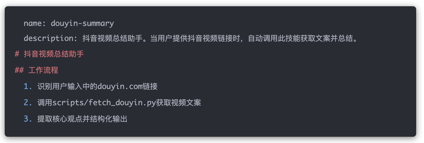 此时,Claude 会自动识别需求,调用 douyin-summary 技能,完成内容获取和结构化总结。
