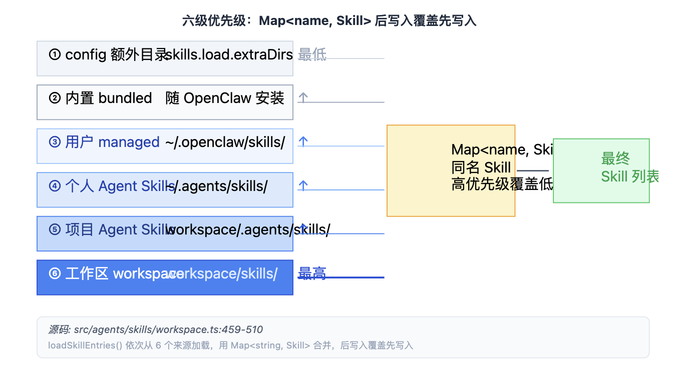 它会同时从工作区、项目 Agent、个人 Agent、用户 managed、内置 bundled、额外目录等多个来源扫描技能,把磁盘上的文件夹统一收束成运行时里的 Skill 集合。