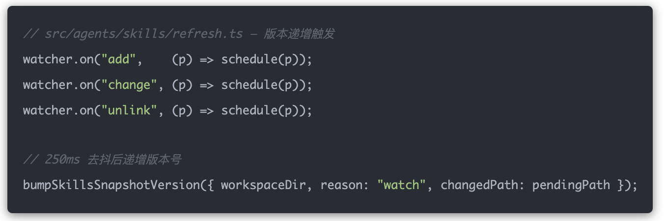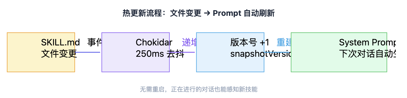 更进一步说,OpenClaw 的 Skills 不是启动时读一次就完了。