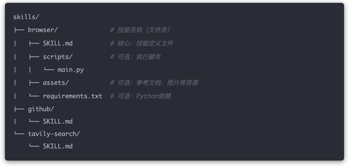 每个“技能”都封装了相应的指令、元数据和可选资源(例如脚本、模板)。