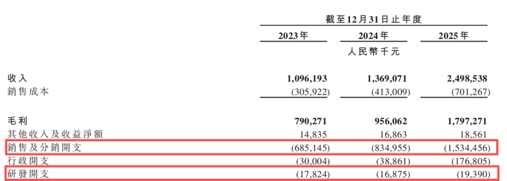与研发的低投入形成鲜明对比的,是公司在营销端的大手笔投入。2025年,其销售及分销开支达15.34亿元,占营收比例超61%,较2023年增长124%,与公司收入上升的趋势保持一致,这也从侧面说明,参半的业绩增长主要依靠营销拉动。