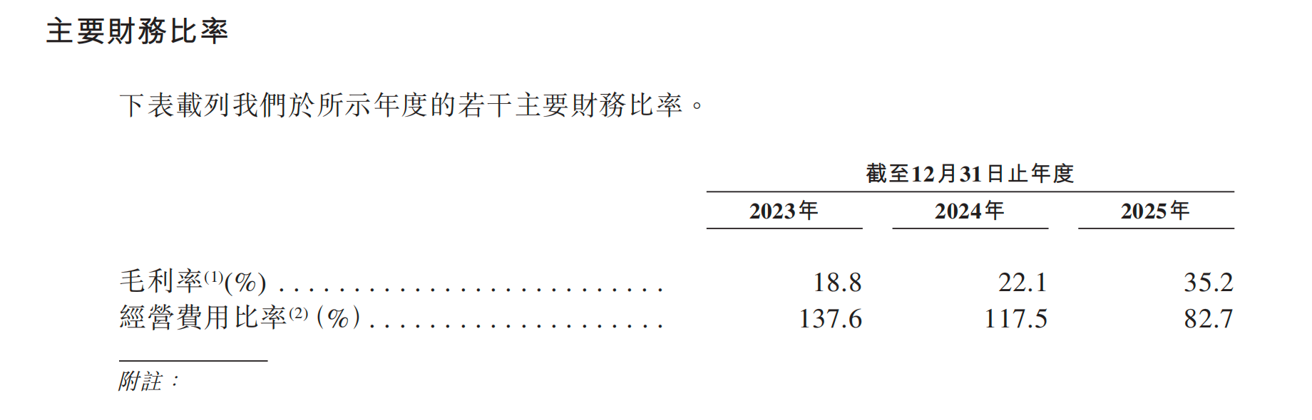 从下面财务数据来看,XREAL已经尽力在省钱。2023年到2025年三年间,毛利率逐年提升,从18.8%到35.2%;经营费用比率逐步下降,从137.6%下降到82.7%。
