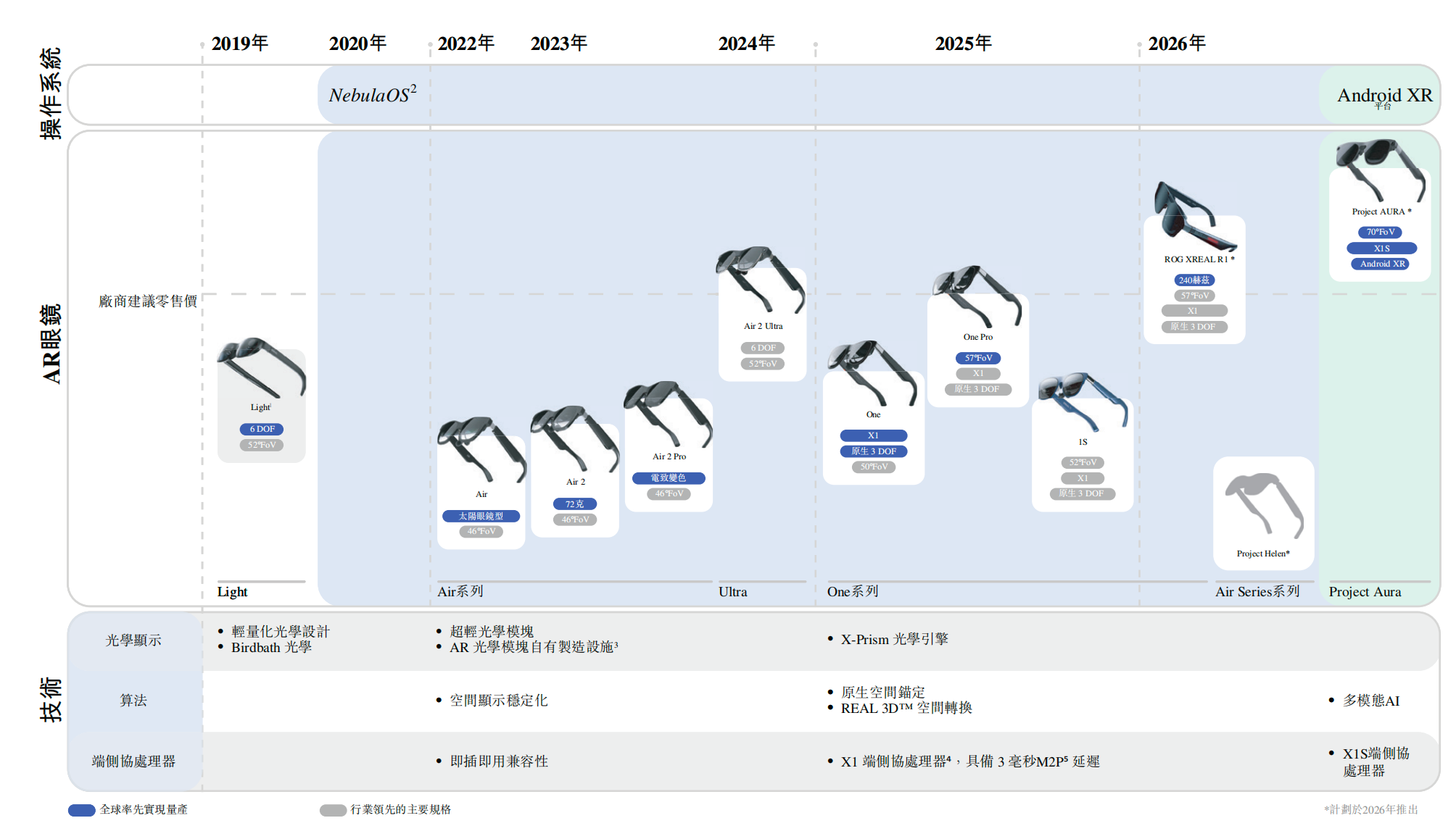 针对多场景市场,XREAL在 2026 年排定新品矩阵:与华硕 ROG 联名的游戏款ROG XREAL R1、走大众性价比路线的Project Helen,以及与谷歌基于Android XR平台共同打造的下一代旗舰Project Aura。