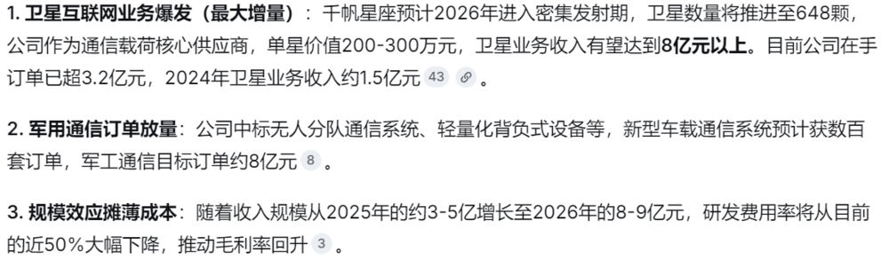 2、卫星互联网(低轨卫星通信):深度参与"千帆星座"(G60星链)建设,是核心的通信分系统承研单位,布局空间段(卫星载荷、相控阵天线)、地面段(信关站)和用户端(卫星终端),是国内首个完成低轨卫星组网地面验证的企业。