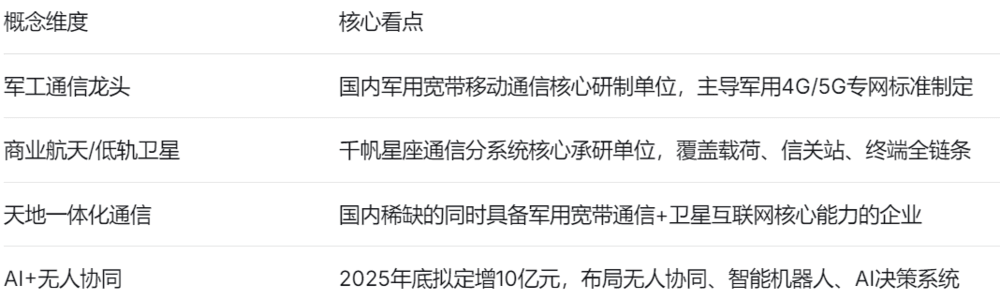 1、军用宽带移动通信:公司是国内军用宽带通信的核心研制单位和总体单位,主导军用4G/5G专网技术体制与标准制定,产品覆盖陆、海、空、天领域,形成"芯片→模块→终端→基站→系统"的全产业链自主可控布局。2025年上半年,宽带移动通信设备收入占比达99.63%。
