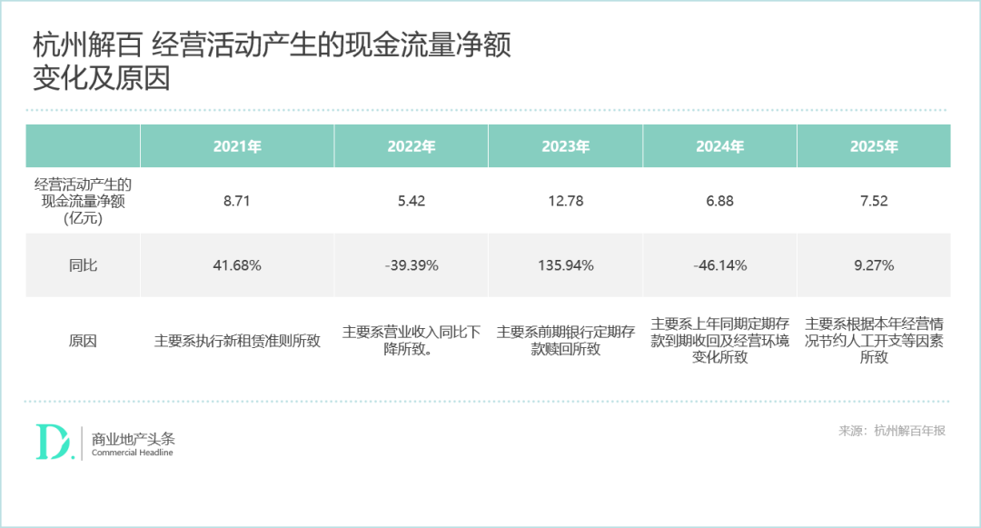 但值一提的是,在一系列积极调整下,解百的营收降幅缩窄了,且经营活动产生的现金流量净额更是重回增长。数据显示,杭州解百2025年的经营性现金流净额却同比增长9.27%至7.52亿元。公司在盈利承压的情况下,加强成本端控制改善现金流的,包括节省人工开支等措施。
