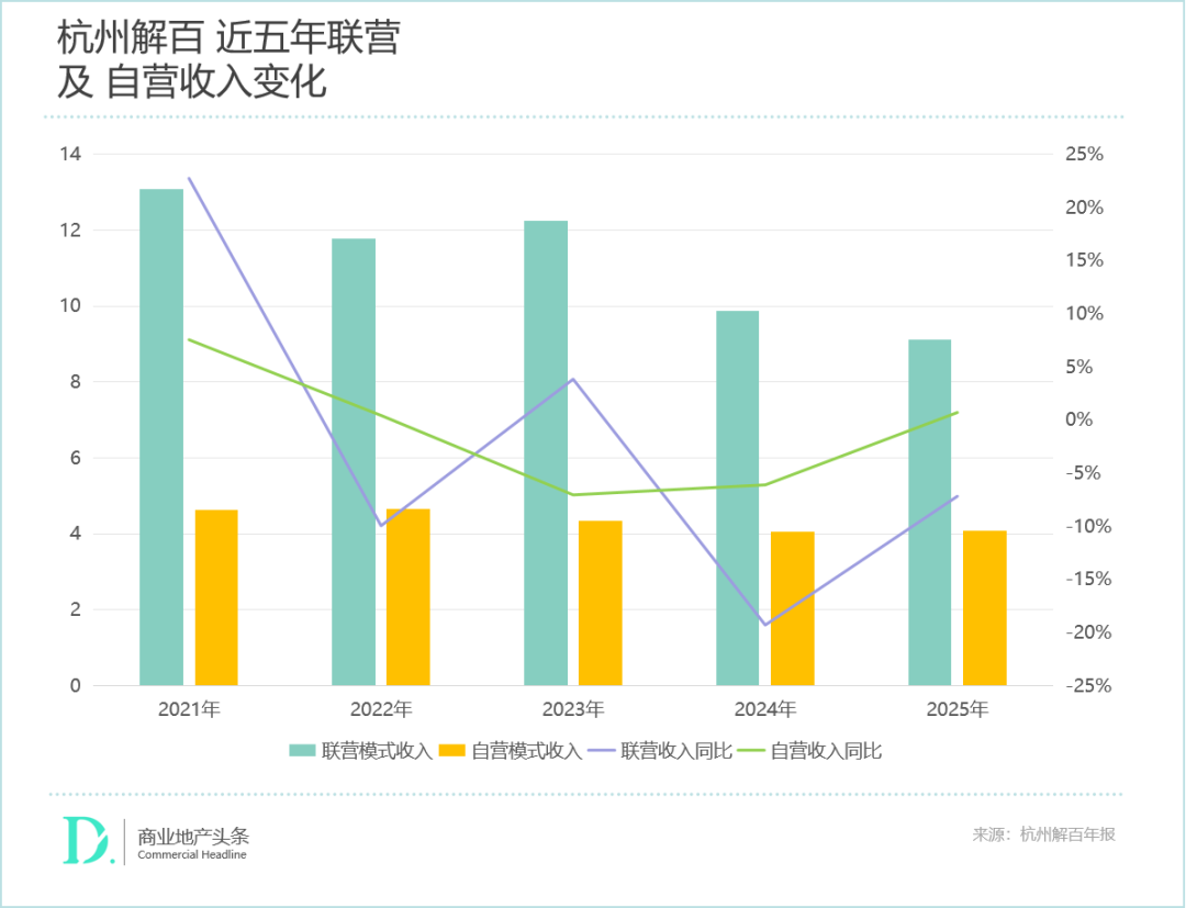 2025年,杭州解百零售业务收入13.27亿元,同比下降5.20%。其中,联营模式收入9.17亿元,同比下滑7.17%,拉低了公司整体盈利水平;自营模式收入4.10亿元,同比2024年略有提升。