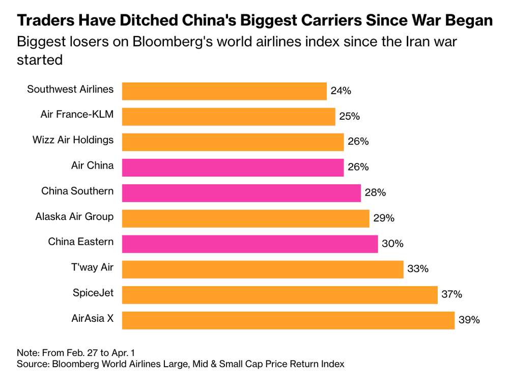 自2月28日冲突爆发以来,国航、东航、南航三大国有航司在港股市场跌幅均超26%,跻身彭博全球航空股价格回报指数中跌幅最靠前的阵营,与市场预期形成尖锐反差。