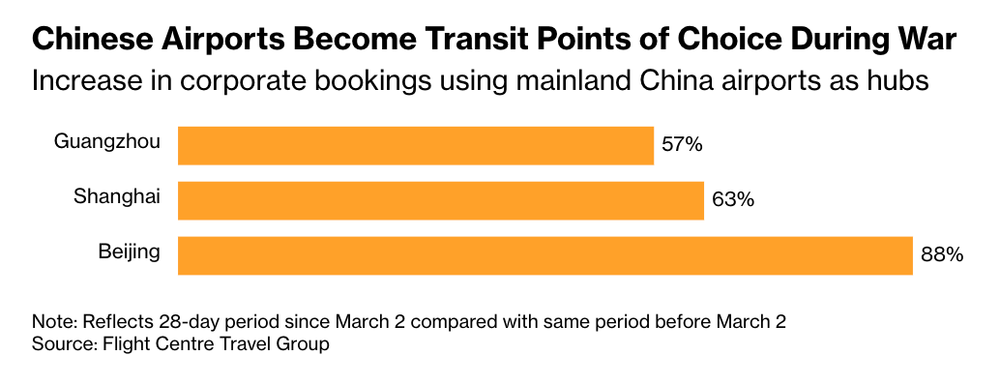 Flight Centre数据显示,越来越多旅客选择中国航空枢纽,作为澳洲往返欧洲及其他长途目的地的中转点。