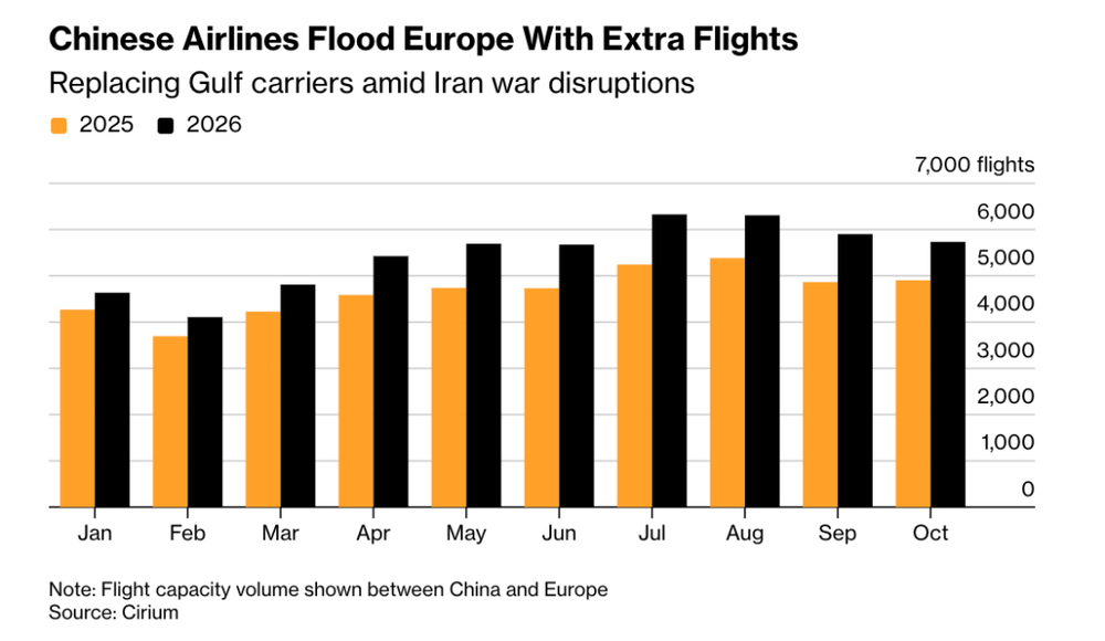 Cirium数据显示,今年夏季中国飞往欧洲的航班数量同比增长约20%,成为亚欧长途航线的核心承接者。