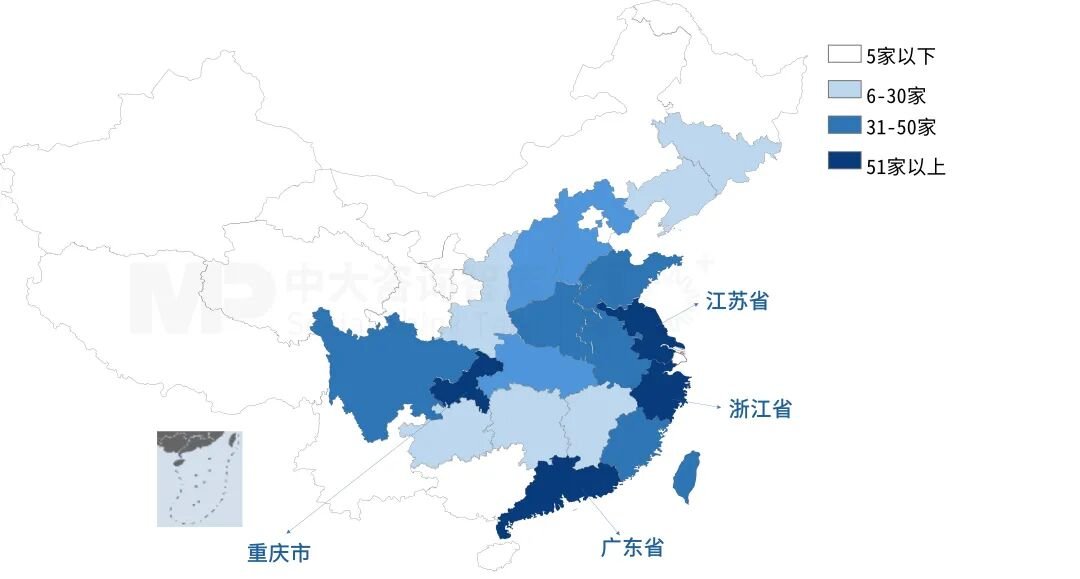 图8 我国摩托车产业Tier 1供应商地域分布图,注:根据《2024年中国摩托车产业发展报告》,国内摩托车产业Tier 1供应商已形成明显的集聚效应,重庆、广东、浙江、江苏四地集中了全国超过70%的核心零部件企业,信息来源:中大咨询整理