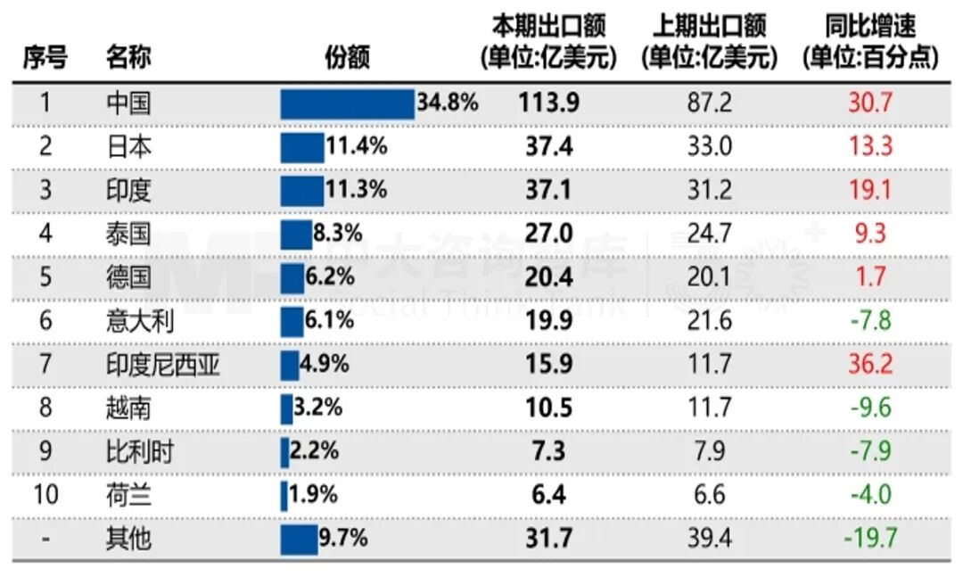 表1 2025年全球燃油摩托车出口金额前十的国家或地区