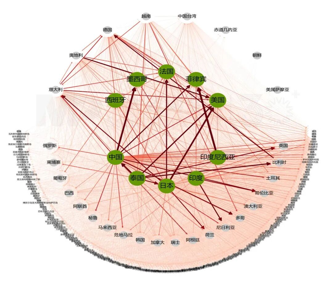 图4 全球摩托车贸易网络流向(基于2022-2025年全球贸易大数据计算),注:图中箭头代表贸易流向,线条粗细代表双边贸易规模大小