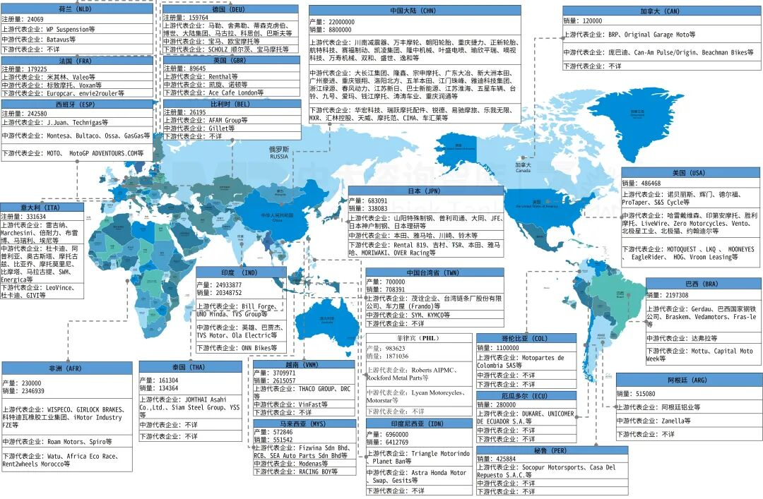 图3 2025年全球主要国家/地区摩托车供给情况(产销量/注册量+企业主体),注:图中数据单位为辆,信息来源:中大咨询整理