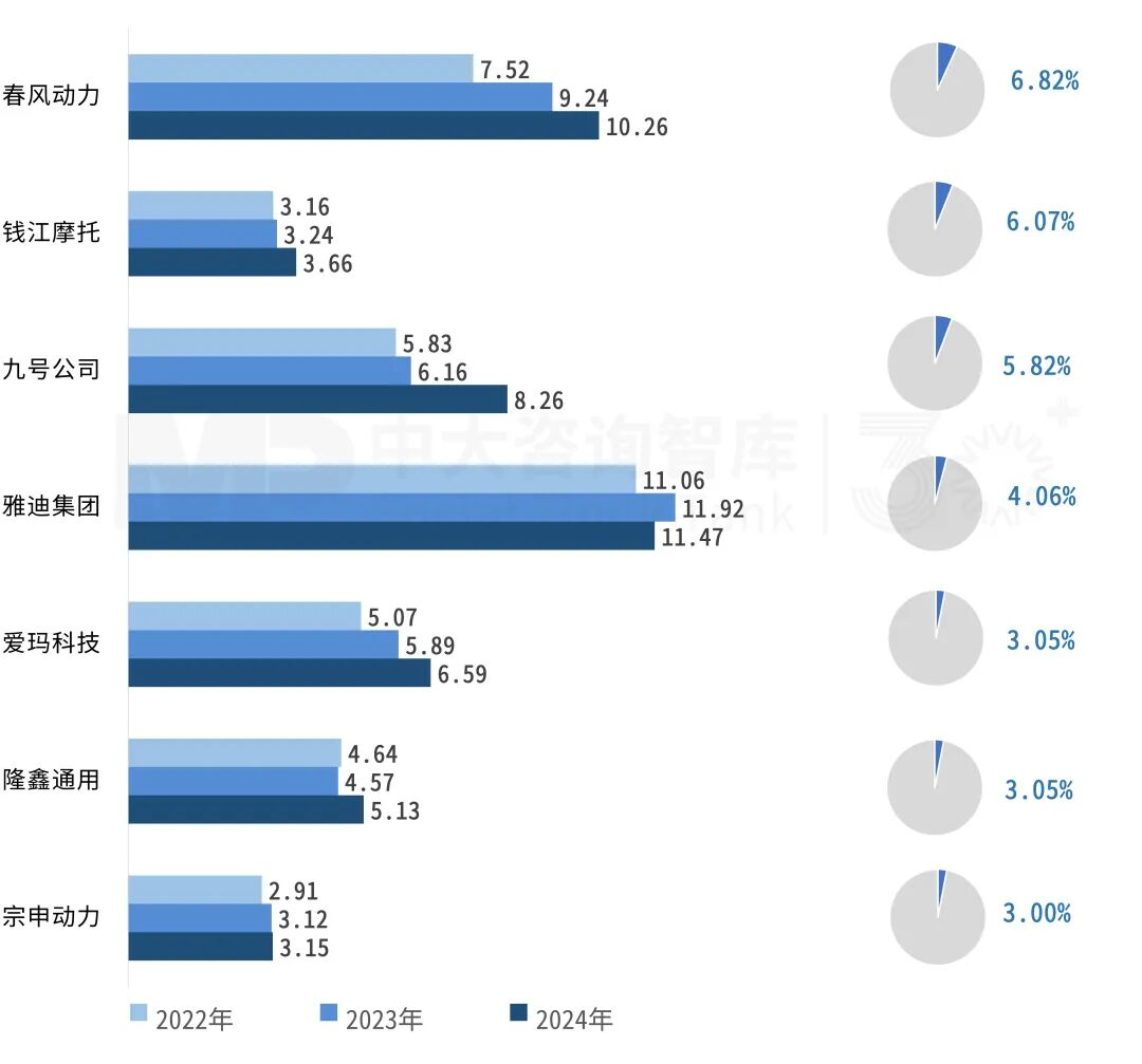 图7 中国摩托车龙头企业2022-2024年研发投入费用情况(亿元)及2024年研发费用在营业收入中占比情况,注:头部企业持续加大研发投入,信息来源:中大咨询整理