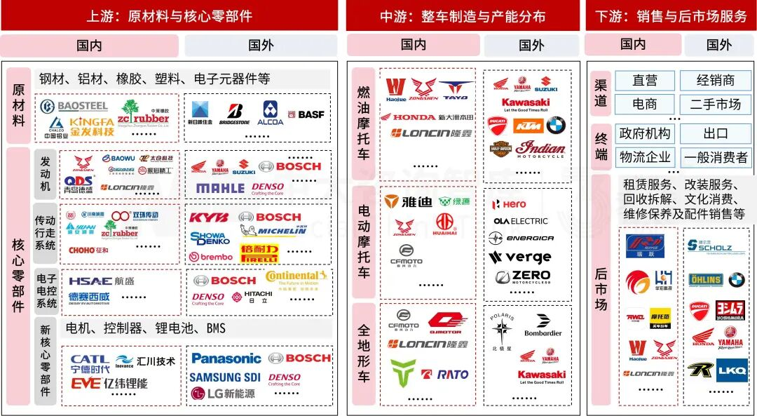 图2 全球摩托车产业链环节及核心企业分布图谱,信息来源:中大咨询整理