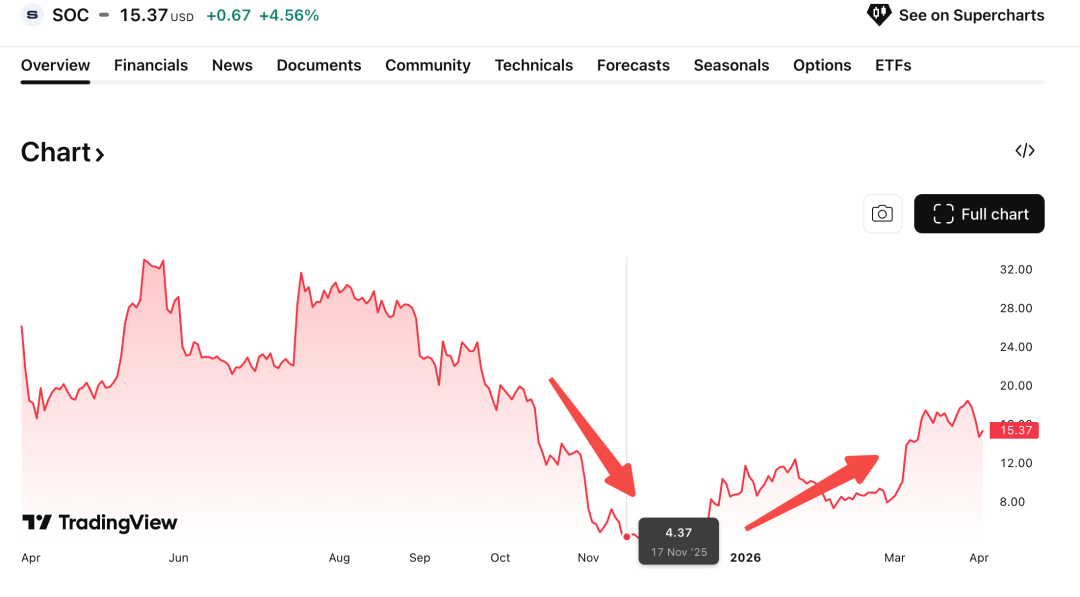 环保让路给石油,在加州这个全美国最绿的州,放在两年前根本不可想象。但中东一开打,什么都可以让路。消息出来当天SOC暴涨37%,全月涨了61%。公司宣布4月1日首次商业出油,日产目标5万桶。