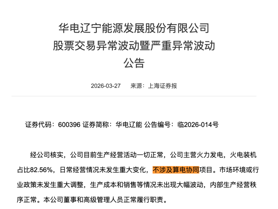 3月24日,华电辽能发了第一份异动公告。里面有一句话:公司主营火力发电,火电装机占比82.56%,日常经营情况未发生重大变化,不涉及算电协同项目。