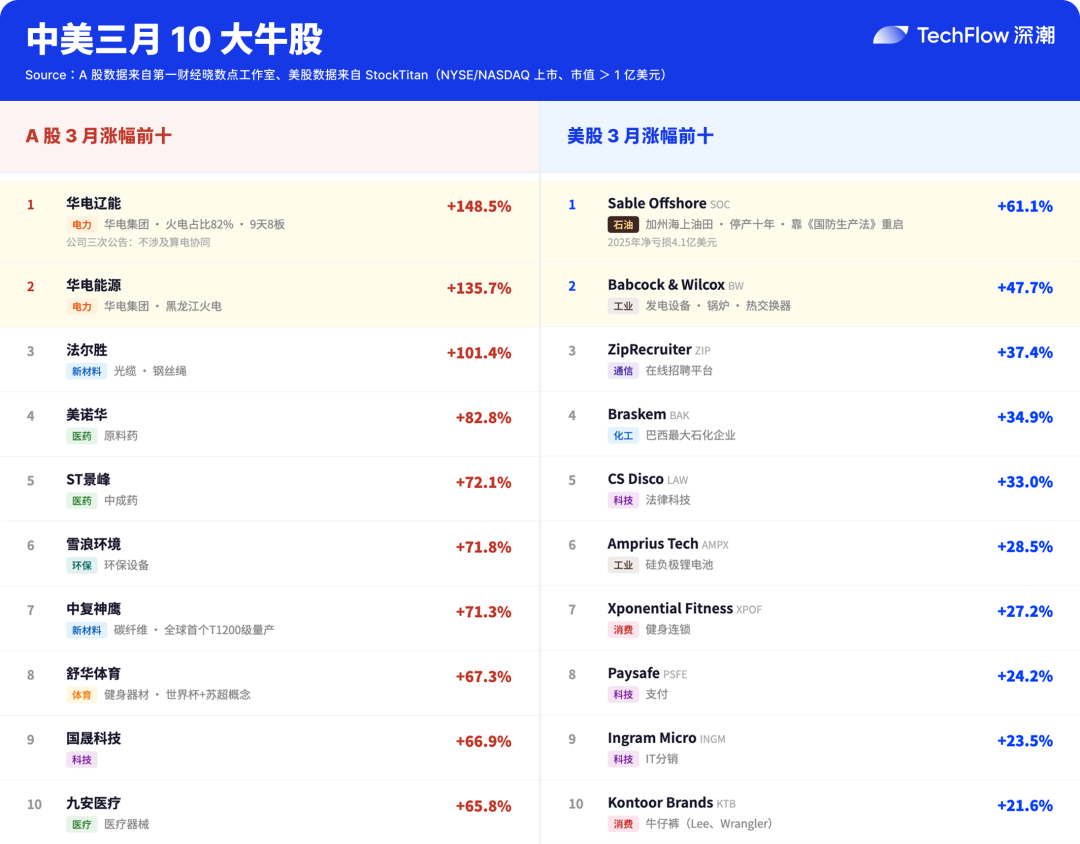本文来自微信公众号: 深潮 TechFlow ,作者:值得关注的,原文标题:《把中美 3 月十大牛股放在一起,能源都是最赚钱的交易》