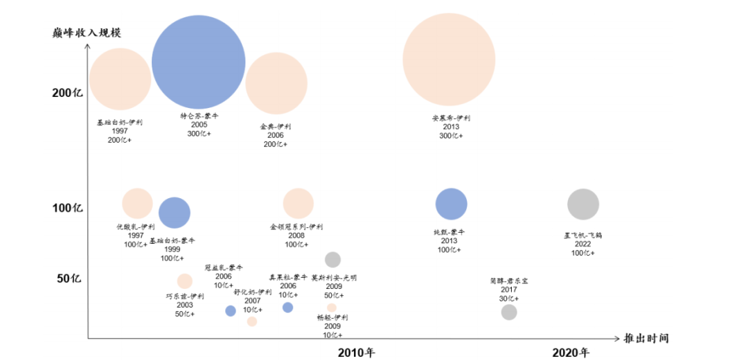 但此时,蒙牛在营收上已落后伊利270亿,从产品来看,伊利除了手握伊利纯牛奶、安慕希和金典三个200~300亿级单品,还有10多个销售额超十亿的爆款产品,蒙牛则以特仑苏和纯甄两大百亿单品与之抗衡,产品矩阵的丰富度与竞争力都处于劣势。