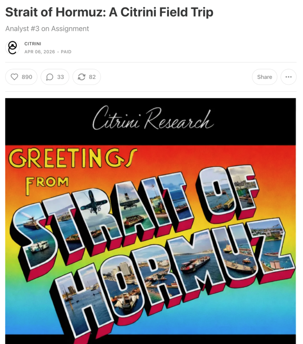 Bro居然在霍尔木兹海峡里游了泳。然后被海岸警卫队拦截、拘留、手机被没收——最后还是活着回来了,把看到的一切写成了报告:"Strait of Hormuz:A Citrini Field Trip",昨天发表了出来。又刷屏了(上一次刷屏是一个多月前,差点搞崩了美国科技股的《2028年全球智能危机》(The 2028 Global Intelligence Crisis))。