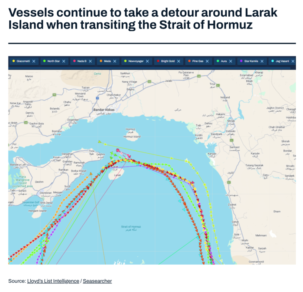 但如果你是一个天天盯着data的分析师,不管肉身有没有到过霍尔木兹海峡,看到的都是不同的故事。Lloyd's List Intelligence早在3月中上旬就发表船只通过的数据,以及报道3月13日革命卫队在拉腊克岛(Larak Island)附近建立检查站。革命卫队审核通过后发放通行代码,船只进入伊朗领海后用无线电核验代码,然后由巡逻艇护送通过(Lloyd's List Intelligence,https://www.lloydslist.com/search#?topic=Strait of Hormuz crisis)。