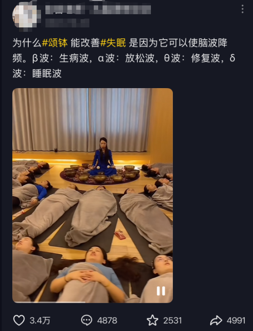 这两年,“疗愈经济”悄然兴起,颂钵音疗是其中的一种,还包括冥想、AI陪伴、感官疗愈、宠物疗愈、艺术疗愈等多个细分赛道。