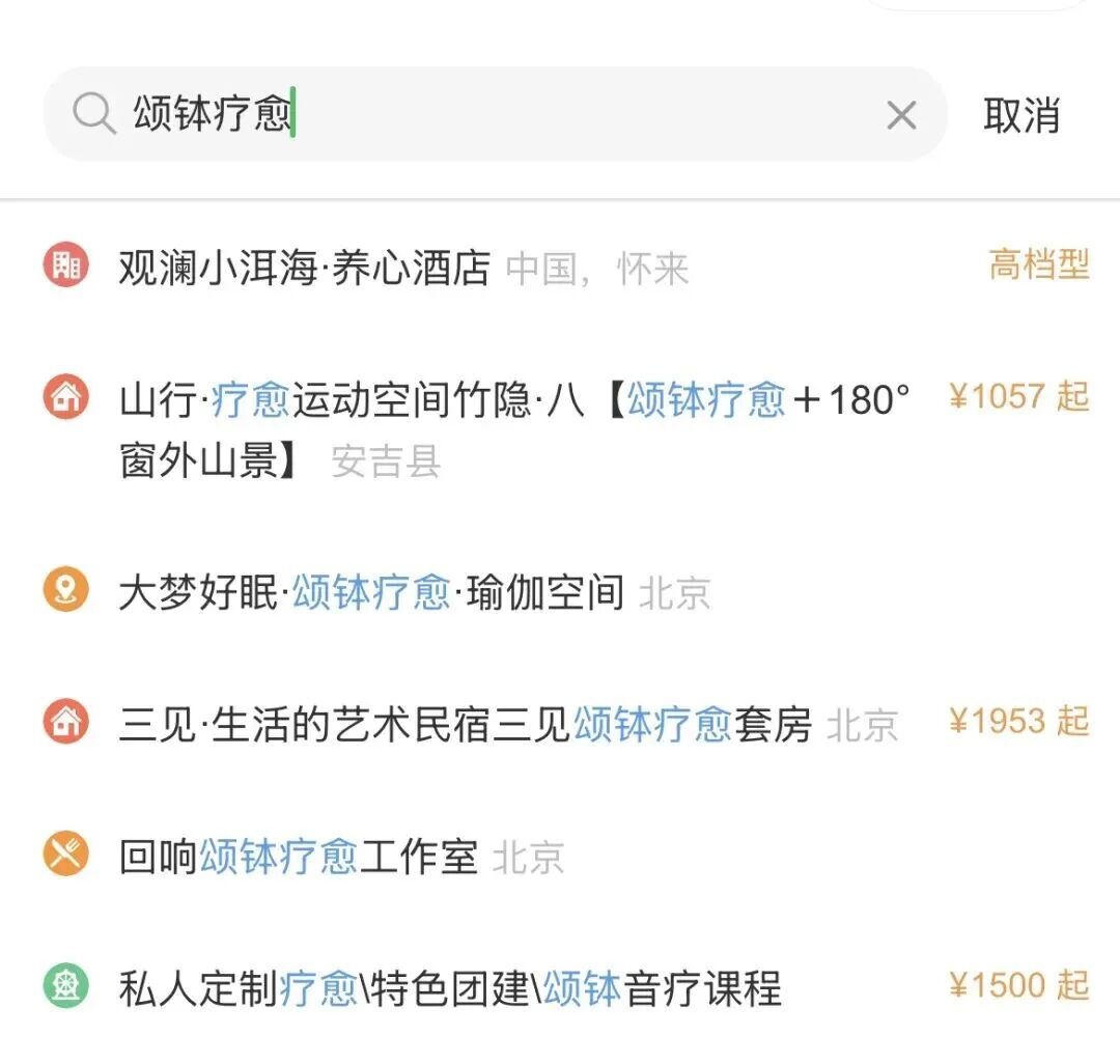 现在颂钵疗愈已经发展到跟酒店、民宿结合的地步。在旅行平台上搜索“颂钵疗愈”,可以看到很多酒店、民宿都提供这类服务,有的名字里直接带“疗愈”二字,一晚上的住宿费用要一两千元。有网友说,去年一家高端酒店甚至推出三天两晚的“沉浸精心颂钵疗愈短假”,收费1.19万元起/人。
