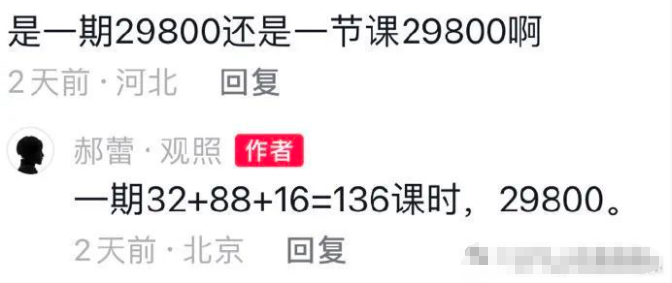 根据网友的提问和郝蕾的确认,一期收费29800元,共136课时,平均每节课219元。