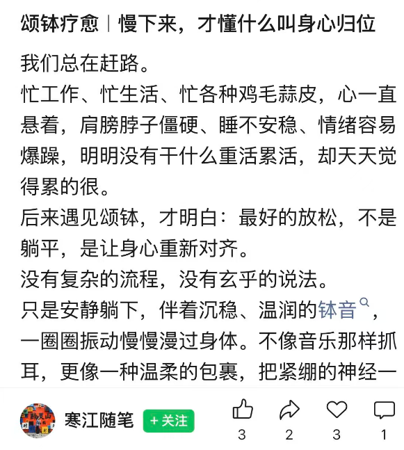 有网友说自己深度参与多次颂钵疗愈,就是静静躺着,感受声音的包裹,她在忙碌工作之余找到了片刻宁静,懂得了什么叫“身心归位”。