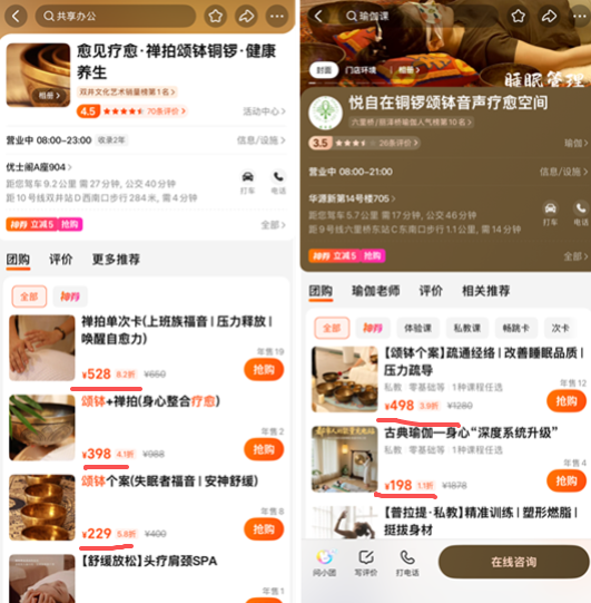八妹去团购网站上看了一下,线下“颂钵”一次体验价要接近200元,要是前面加个“禅”字,一小时的价格可就要500元了。