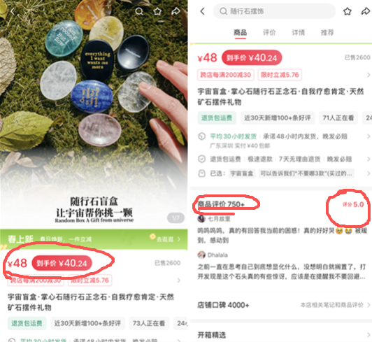小红书上,有那种可以开盲盒的正念石,看着像是玻璃,但售价48元,到手价也要40。