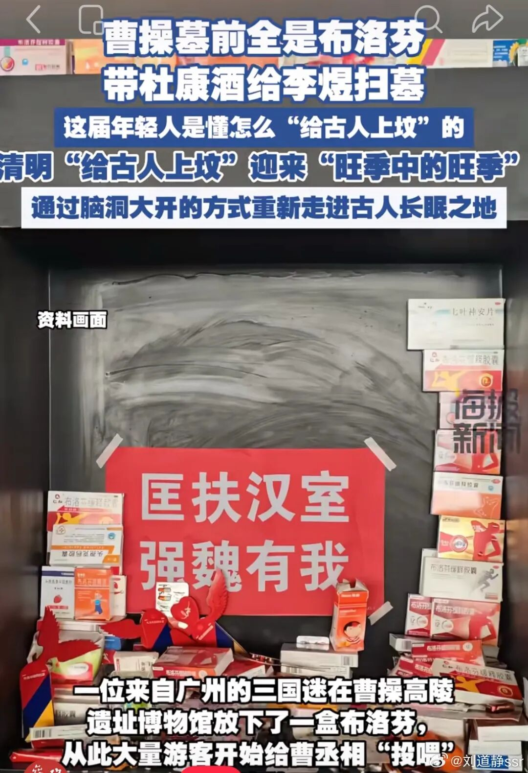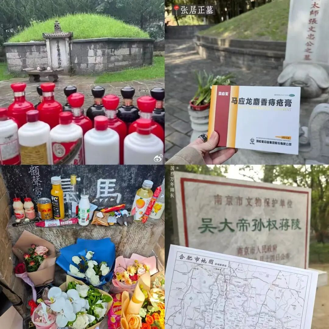 曹操墓前布洛芬堆成小山,张居正墓前痔疮膏整齐排列,李白墓前美酒与诗集相伴,诸葛亮墓前躺着成都到西安的高铁票,岳飞、辛弃疾、左宗棠等先贤墓前,也出现了国之重器模型与疆域版图……