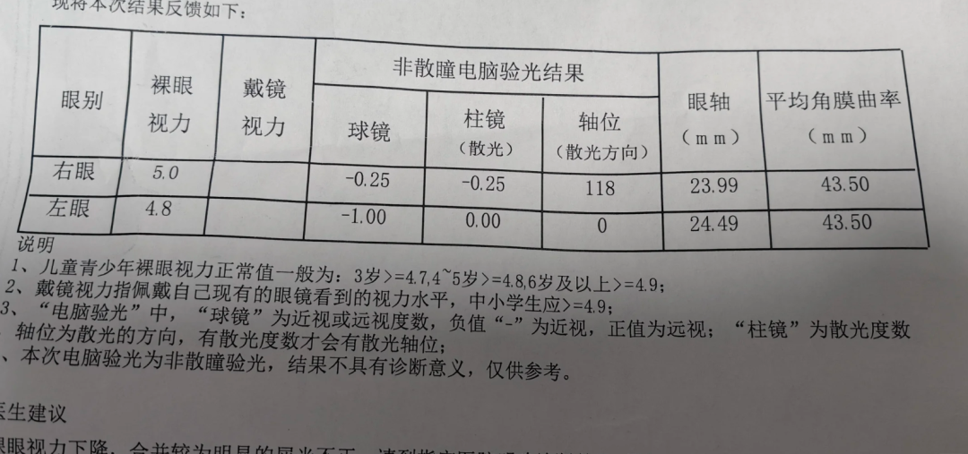 视力筛查单显示,小宇的裸眼视力降至0.8,眼轴24.49mm,老师提醒需及时干预。