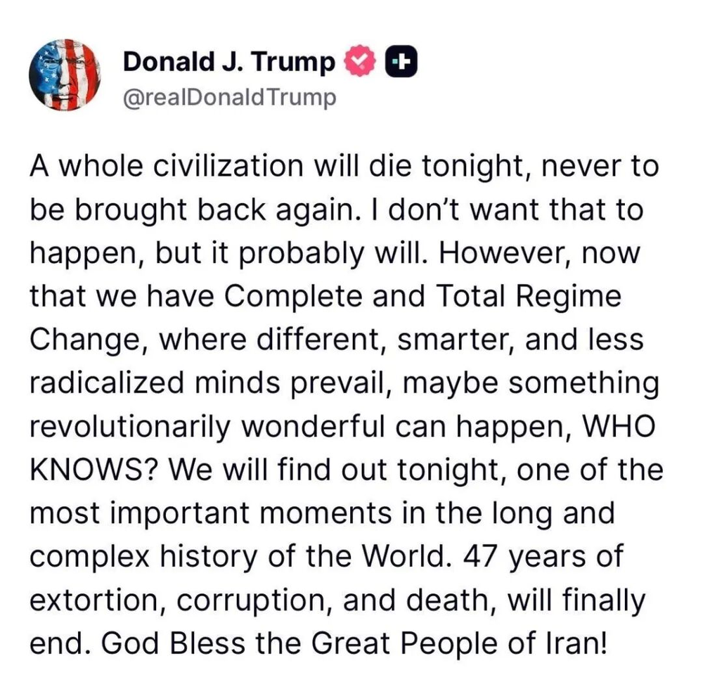 不过可能是战争罪嫌疑不够大,到4月7号,离新的最后通牒没几个小时时,特朗普宣称整个伊朗文明会被消灭: