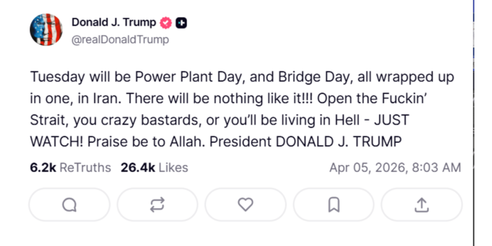 不得不说,若按特朗普周日发的那个充满脏话的帖子执行,有很大的战争罪嫌疑——攻击发电站、桥梁都属于攻击民用设施。而且周日还是复活节,在复活节发这么一段脏话比例极高的话,结尾还加上一句讽刺伊斯兰信仰的“赞美真主”,特朗普看来确实是嫌美国盟友太多,希望清洗朋友圈。