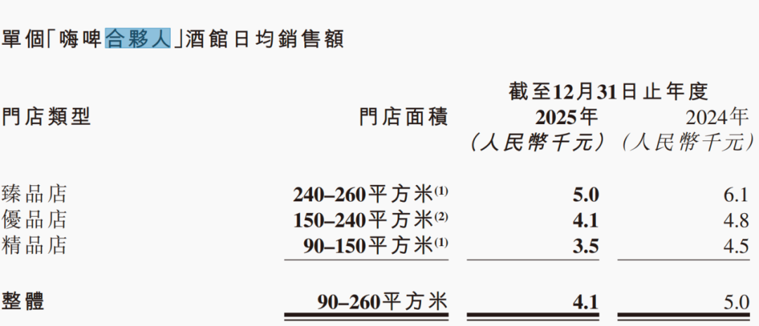 具体来看,2025年同店(指两年均营业超过300天的酒馆)数量为135家,同店销售额合计从2024年的5.08亿元下降至4.15亿元,同比减少18.4%,同店单店日均销售额从1.04万元降至0.85万元,降幅达18.3%。