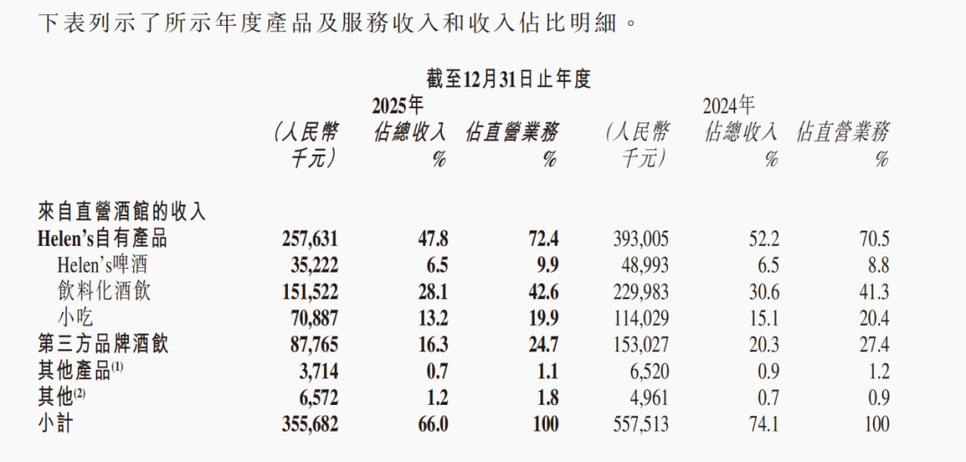 然而,这并未能阻止整体收入的下滑。直营酒馆中其自有产品的收入从3.93亿元降至2.58亿元,降幅超过34%,说明更高的毛利率无法抵消销量的大幅减少。同时,第三方品牌酒饮的收入也从1.53亿元降至0.88亿元,降幅达42.5%。无论是自有产品还是第三方产品,在直营渠道的销售均出现了显著萎缩。