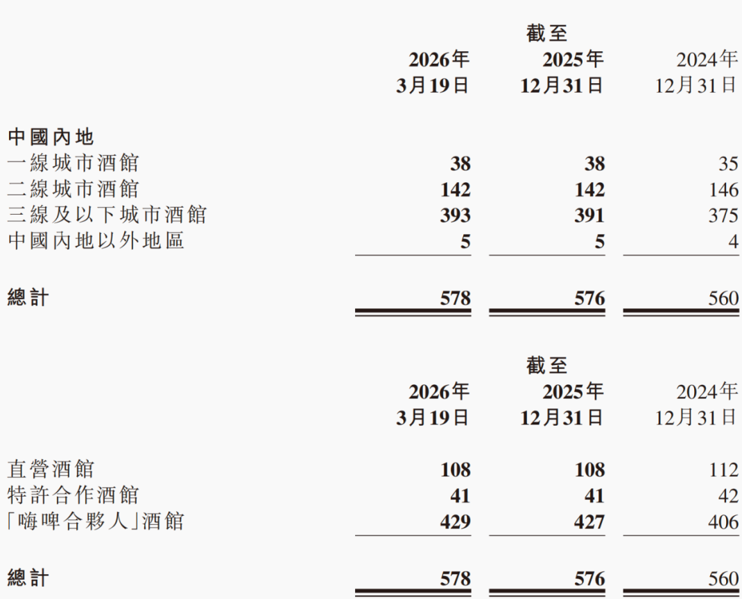 其中,“嗨啤合伙人”加盟门店达到427家,较2024年末的406家继续增长,占总门店数的74.1%;而直营酒馆从112家进一步缩减至108家。从数量上看,加盟体系已完全超越直营成为海伦司门店网络的主体。