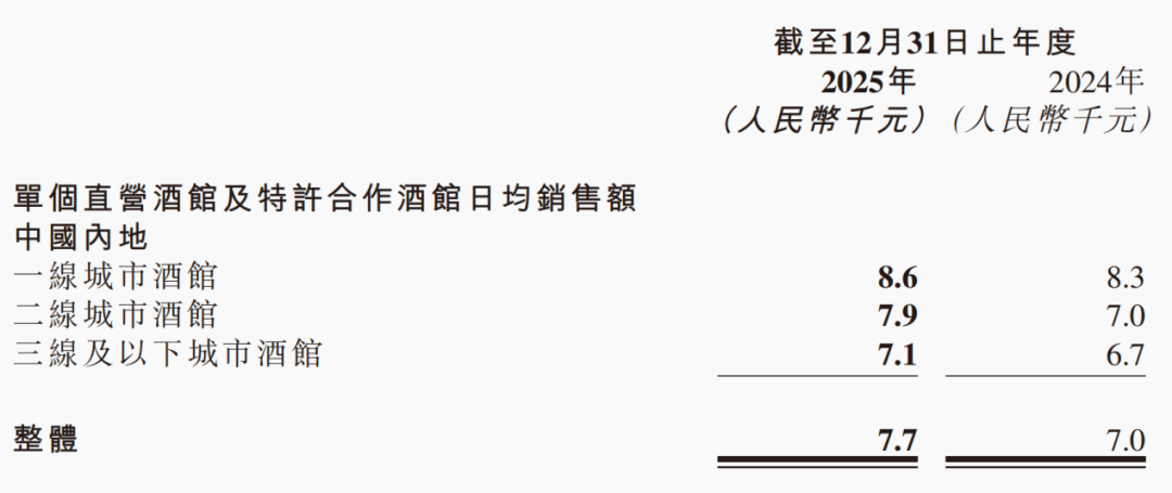 与之形成鲜明对比的是,被公司逐步收缩的直营及特许合作酒馆,其整体单店日均销售额却从2024年的7000元提升至7700元,增长了10%。
