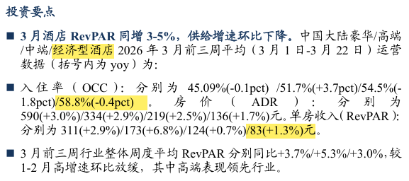 东吴证券2026年3月的报告显示,经济型酒店实际RevPAR约83元,入住率约58.8%。