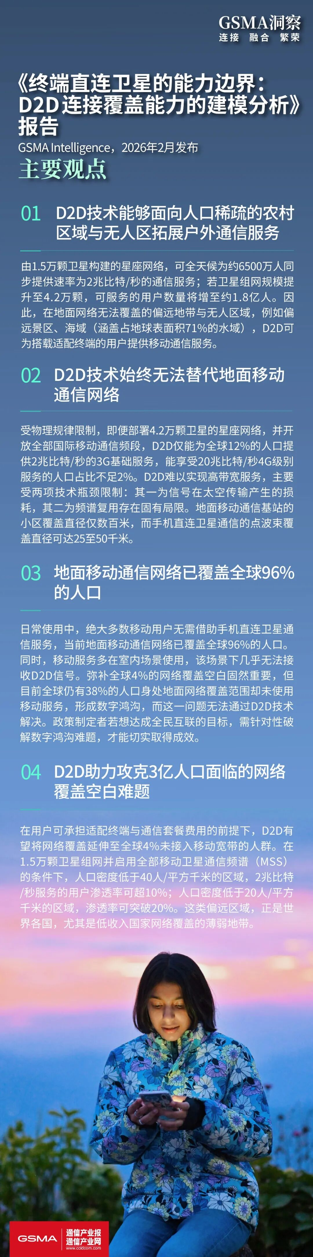 为此,GSMA智库开展了专项研究,分析不同卫星星座组网方案与频谱配置对D2D通信能力的影响,最终形成了《报告》。