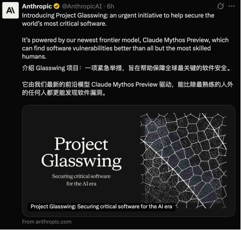 就在今天,Anthropic的Claude Mythos Preview已通过Project Glasswing公开亮相,大幅提升了编码能力、推理能力和网络安全能力;