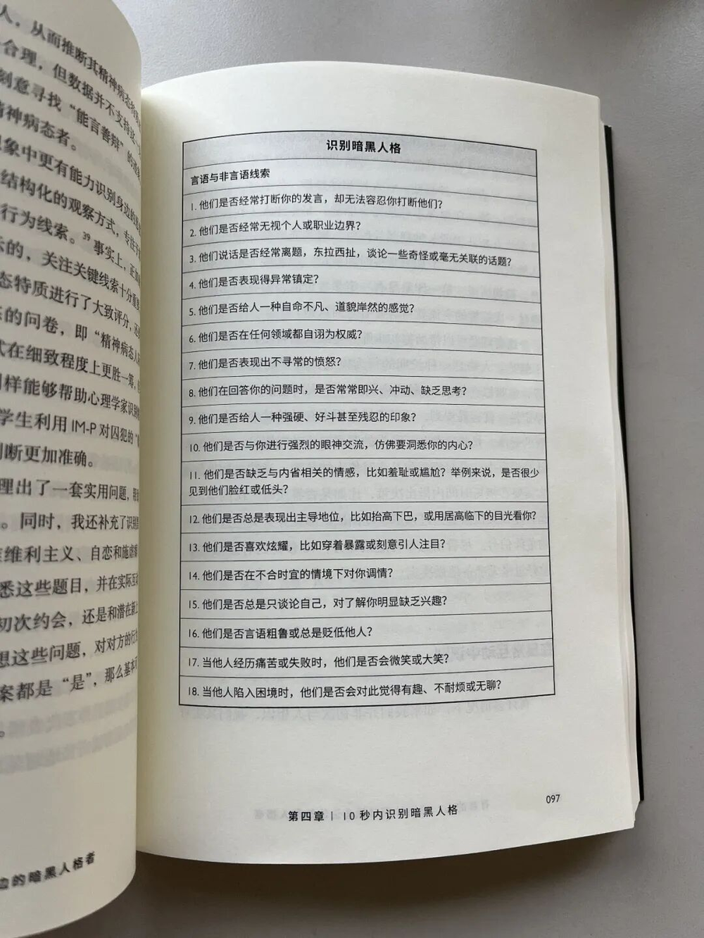 比如,她提到,那些初见时就尝试与你进行强烈的眼神交流,似乎想要洞穿你的内心的人,或者那些当他人经历痛苦或失败时,反而会微笑或大笑的人,更有可能属于暗黑人格者。