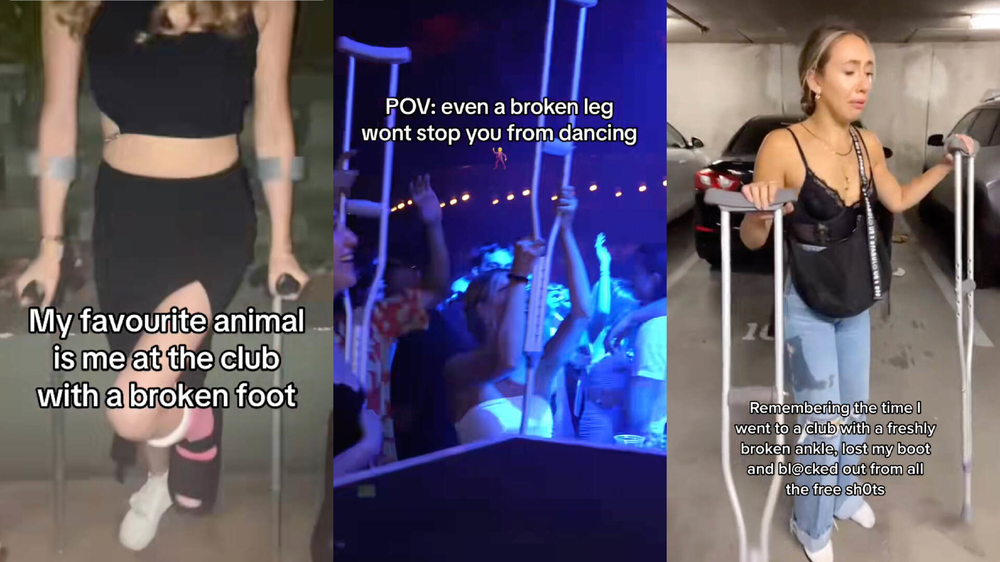 甚至还有人发视频求安慰,说自己刚断了脚就去夜店了,结果喝大之后把护具蹦丢,最后只能一边呕吐一边哭着蹦回家。太惨了。