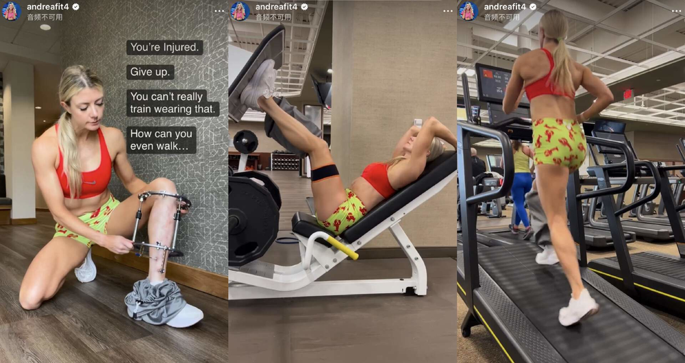 在恢复后期,Andrea仍然需要用外置医疗器械固定骨骼。但她本人认为能走就是好了,好了就是能健身了。在一条视频中,她不仅恢复了负重蹲起和跳跃,甚至还用起了大重量的倒蹬机。最后又上跑步机又做了会儿有氧。