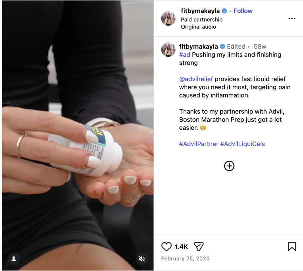 甚至有的网红为了能恢复训练,开始借助药物止痛。她鼓励群众一边服用布洛芬一边带着伤完成训练。“布洛芬不到30分钟就能起效,它可以帮助我坚持下来,完成一次不错的锻炼。”