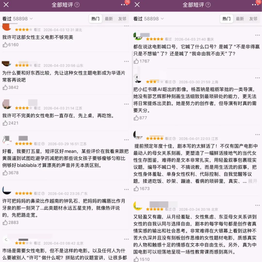 但批评的声音也并不少。“像两个小时的抖音女性主义爆梗样板戏”,“自我感动式的表演型人格下的女性主义八股文”,不少人觉得它议题堆砌、全而不精、口号先行。
