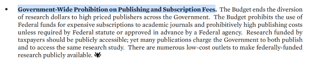 预算文件指出,由纳税人资助的研究成果应当能够公开获取;然而,许多出版机构“既向政府收取出版费,又收取同一研究的访问费”。并指出“存在大量低成本的渠道,可以使联邦资助的研究成果向社会公众开放”。