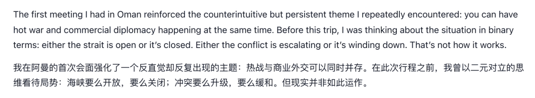 3号分析师在报告里写道:在此次行程之前,我们都以二元对立的思维看待局势,认为海峡要么开放,要么关闭;冲突要么升级,要么缓和。但现实并非如此运作,这是一个反直觉但却反复出现的主题,热战与商业外交是可以同时存在的。